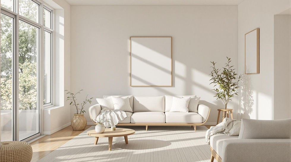 Transformed a residential living room into a nature-inspired haven. Features include expansive windows for natural light, indoor greenery arrangements, and organic textures like linen, wood, and polished concrete to create a peaceful ambiance.