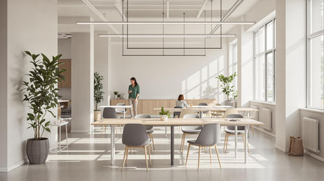Redesigned a commercial office space into a calming retreat. Incorporates clean lines, ergonomic layouts, acoustic panels, and a palette of soft neutrals to boost productivity and reduce stress in a busy work environment.